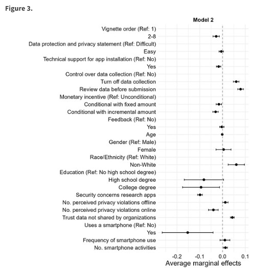They found that, on average 44% of respondents said that they would participate in at least some of the described studies. Surprisingly, simplicity seemed to make some people less likely to participate—with simpler language incurring an average of 1.4 percentage point decrease and technical support incurring an average of a 3.4 percentage point decrease. Greater data privacy conveyed an 8 percentage point increase between the “no privacy” option and “review data prior to submission” options. Personal data summaries only increased reported tendency to join by 0.7 percentage points. Unconditional money incurred an average gain of 3.8 percentage points versus the lowest performing category ($6 to start + $2 per day).